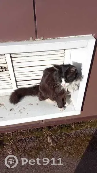 Пушистый кот, черный с белой мордочкой и носочками. Ласковый, видно, что домашний. Но уже грязный и исхудавший. Приветливый и спокойный. От корма отказывается. Курсирует между школой 42 и домом на Севернрй 36.