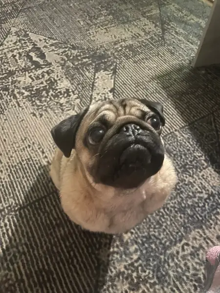 Мопс бежевый,взрослый. Найден в районе 16-17 часов на Герцена,у магнита . Видно,что парень домашний,ухоженный.