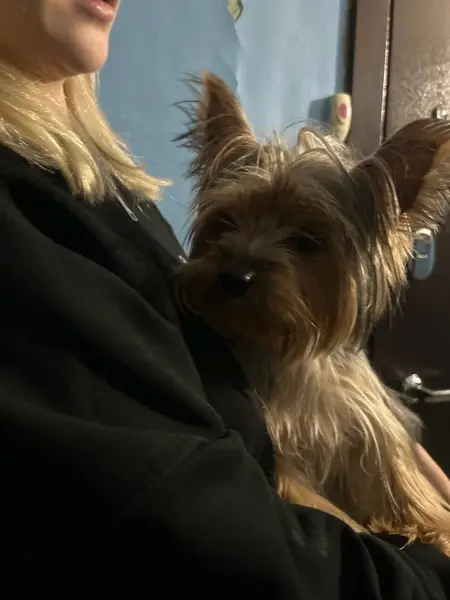 Коричнево серый, подстрижена челка, видно что завязывали хвостик на макушке, на вид лет 6-7