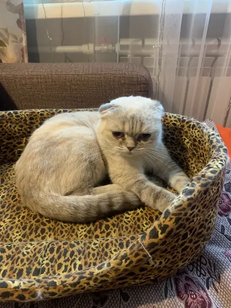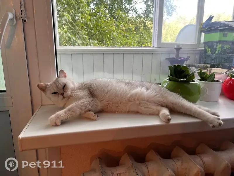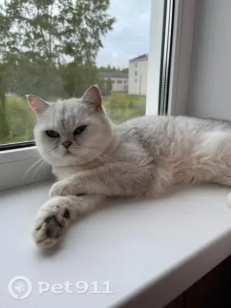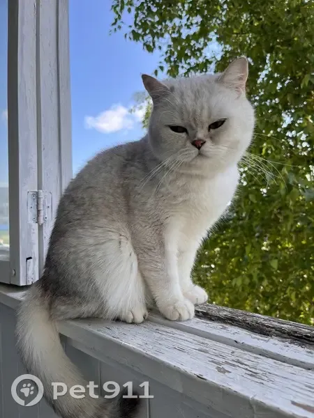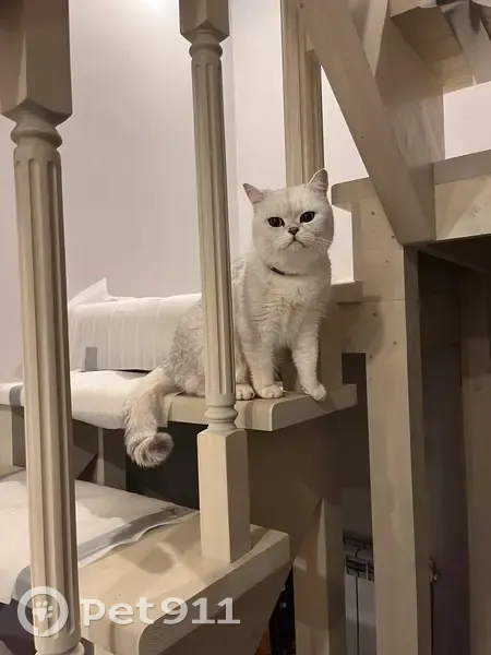 Окрас белый с темным на кончике шерсти ( серебристая шиншилла), порода Британский. Был в ошейнике( шнурке) ,на застежке кличка и номер телефона. Кот кастрирован. Глаза зеленые. Кот квартирный на улицу никогда не ходил. При переезде в частный дом, вышел на веранду и пропал.
