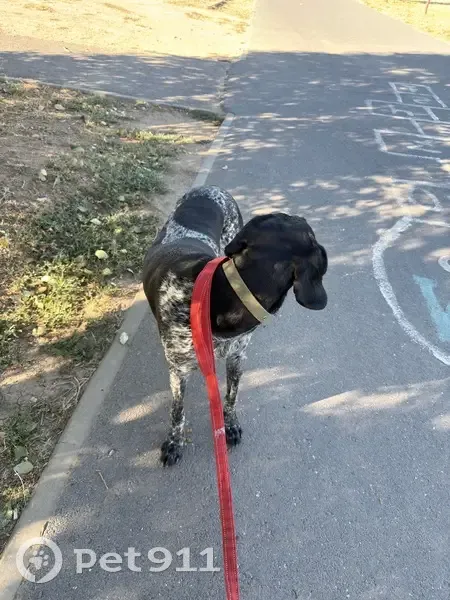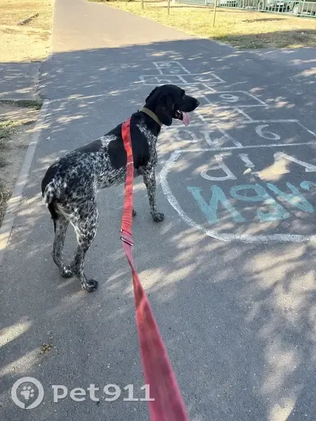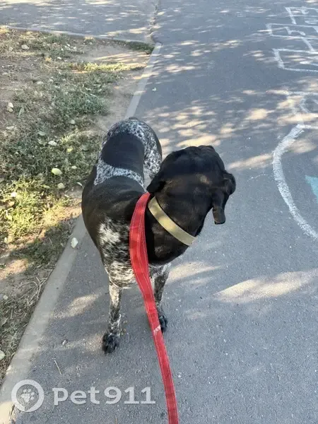 Черный с белым крапом. Курцхар. Гоголь на правой лапе сбит. Собака на панике за 3 часа не присел и не прилег. Бегал по перекрестку отвела на работу. Пробуду с ним до двух.