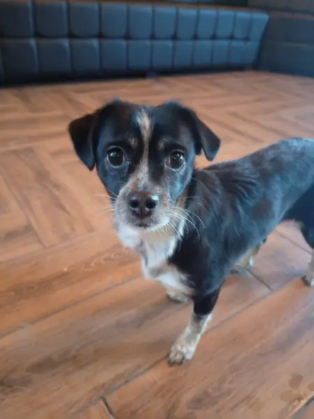 Маленькая собачка,размером с кошку, черная с белым, огромные грустные глаза. Умная, контактная, явно домашняя, чистая. Была найдена утром 18 января в лютый мороз у подвала 9-этажки. Замерзала, плакала.