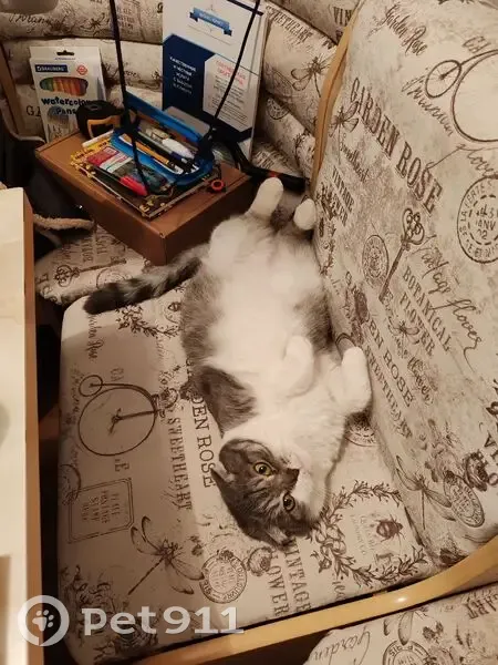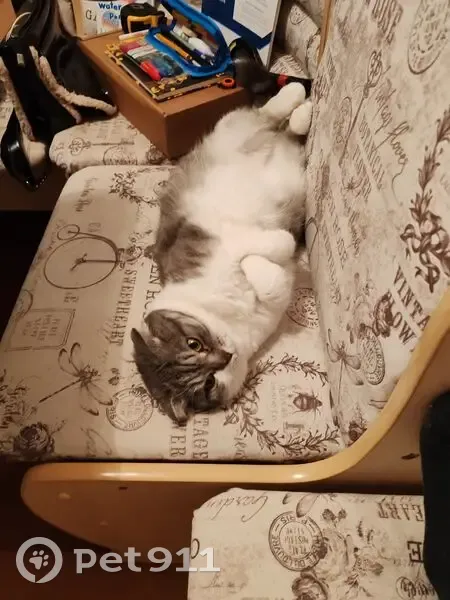 Серо-белого цвета. Вислоухая, коротко шерстная. Выпустил в подъезд погулять, осьавил буквально на 10 минту. Когда решил забрать её в квартиру, то уже её не было в подъезде. Обошёл все этажи.