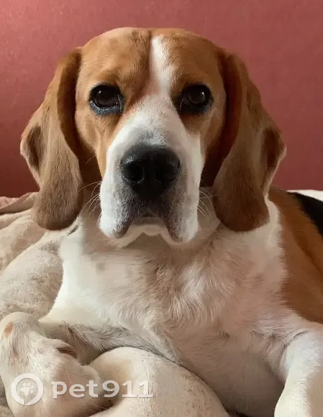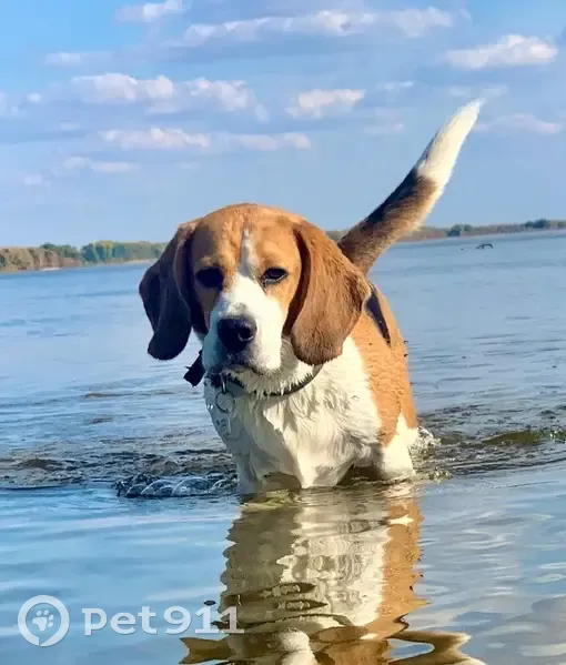Большие висячие рыжие уши, черная спина, белая грудь и лапы. Кончик хвоста белый. Есть клеймо на животе. Отличительная особенность на момент пропажи: на задних лапах есть залысины красного цвета. На нём был ошейник серо-зеленого цвета с металлическим круглым медальоном. Сбежал со двора в Погромном (Волжский).