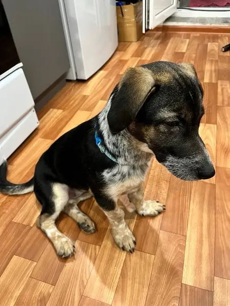 Черная, с рыжими и белыми пятнами, собака беременная, возможно уже родила, убежала через соседей, снт рассвет.