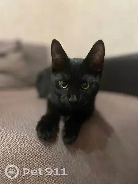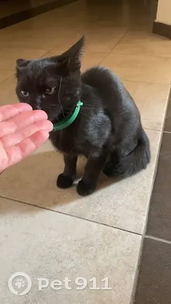 Малыш прибился к ногам прямо возле лифта на 6м этаже. Видимо бегал по всему дому по лестнице. Полностью черный котенок. Месяцев 6 примерно. Имеется зеленый ошейник. Активный, игривый, с хорошим аппетитом. Сходил в туалет в ванную. Явно приучен. Значит домашний.