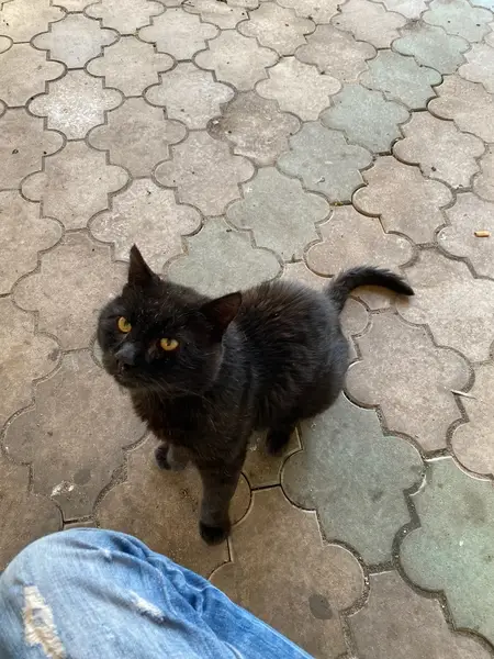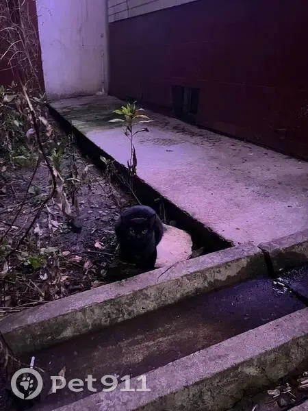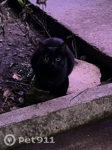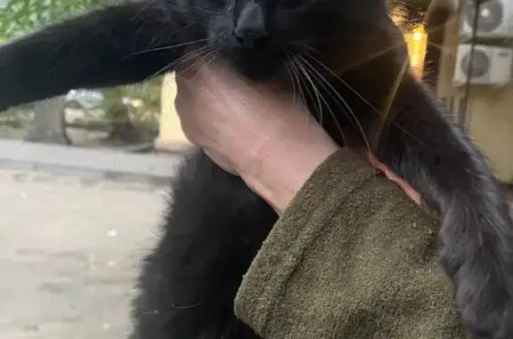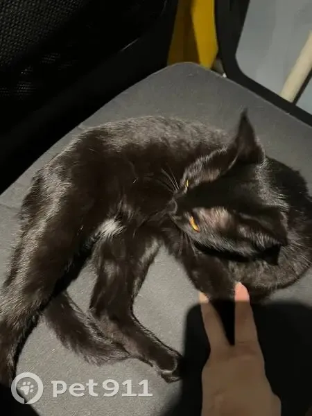 Кошка, молодая на вид около 1 года, черного окраса, пара белы- волосинок на груди и белое пятнышко на животе между задних лап, оранжевые глаза, чистая, ищет контакта с людьми и общительная, явно домашняя