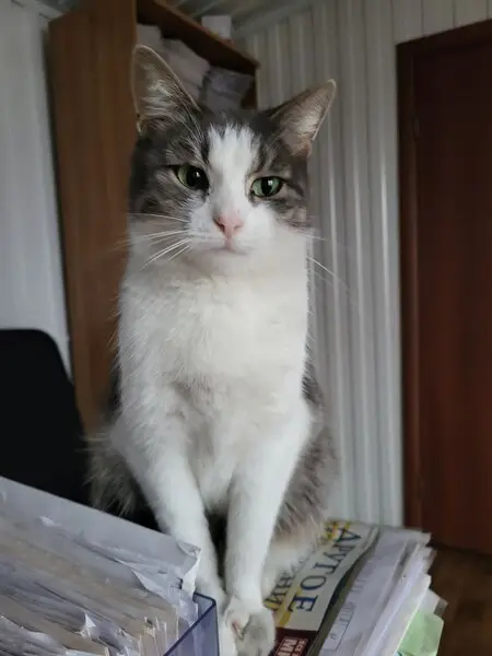 Кот серый с белой грудкой и белыми лапками, очень ласковый.
