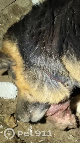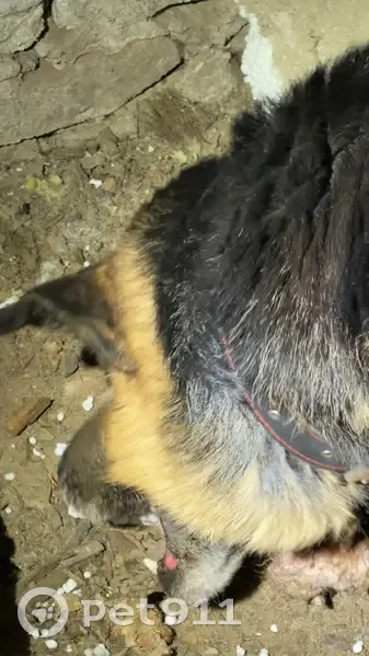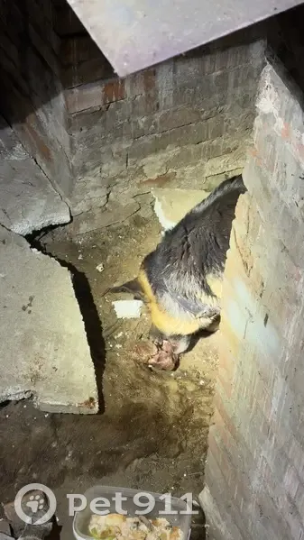 Найдена овчарка! С ошейником Молодой/ая! Не агрессивный Провалился в заброшенном гараже в яму. Пытались спасти с лестницей, с куском мяса безуспешно, покормили, Молодой пес или сука неизвестно , прошу неравнодушных людей помочь его достать, в этой ловушке умерла не одна собака( на фото видно шерсть) черно красный ошейник, 89507700033 юля