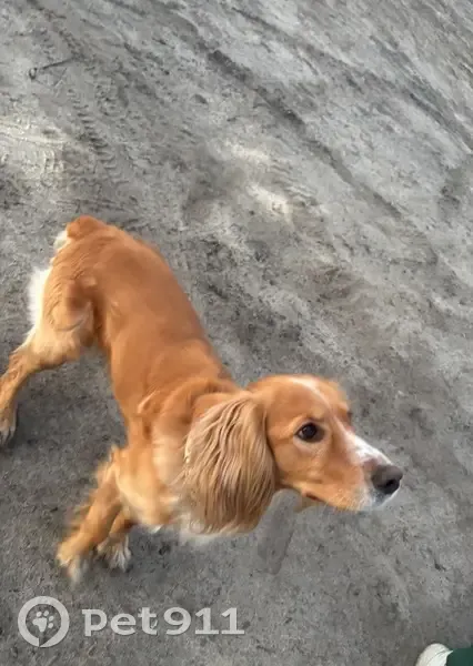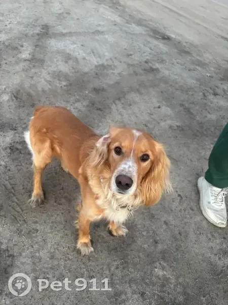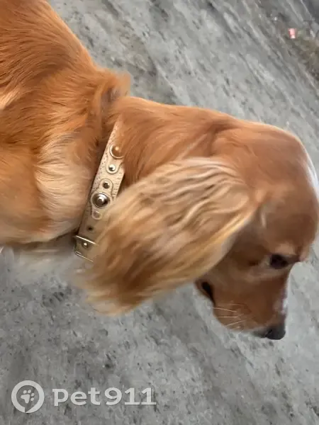 Собака , похожа на спаниеля, рыжего окраса, хвост купирован. Ошейник бежевого цвета. Собака ухожена, людей не боится.