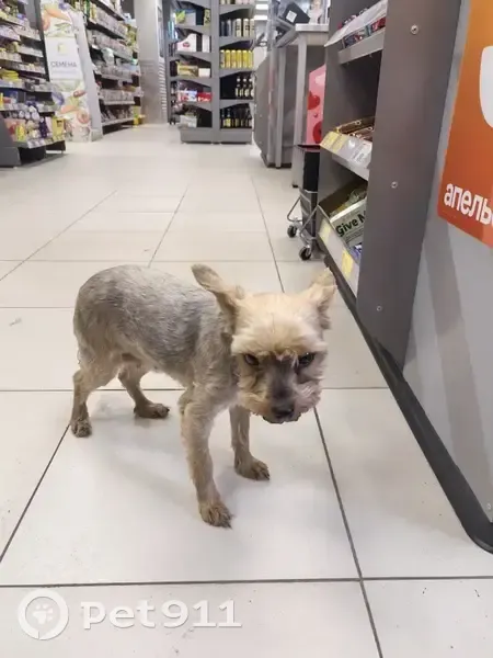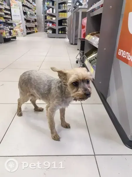 Сабака зашла в магазин погреться. Без ошейника. Йоркширский терьер. Знает команды.