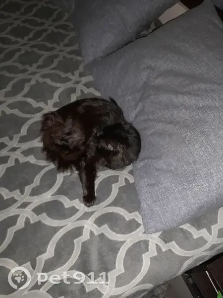 Чёрный окрас,но чуть чуть отдает коричневым; гладкая, мягкая шерсть; зелёные глаза;очень ласковый;плохо отзывается на " кис кис", но может отозваться на "Саныч"