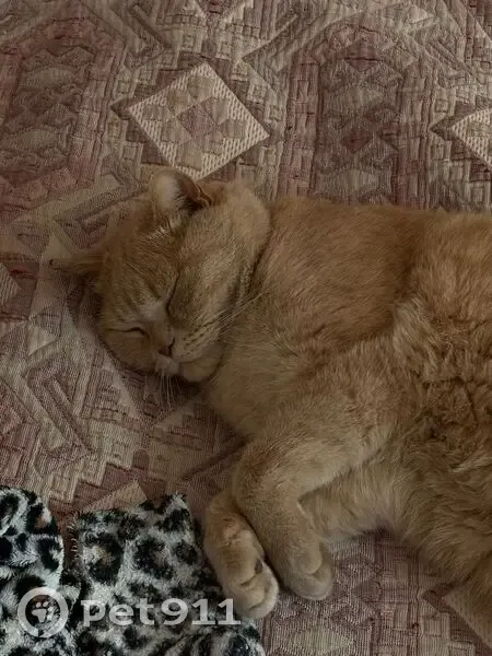 Рыжий большой кот с красным ошейником. На ошейнике кличка и номер телефона для связи. Отзывается на ПЕРСЕЙ, НЕ отзывается на кис-кис. Спокойный и осторожный