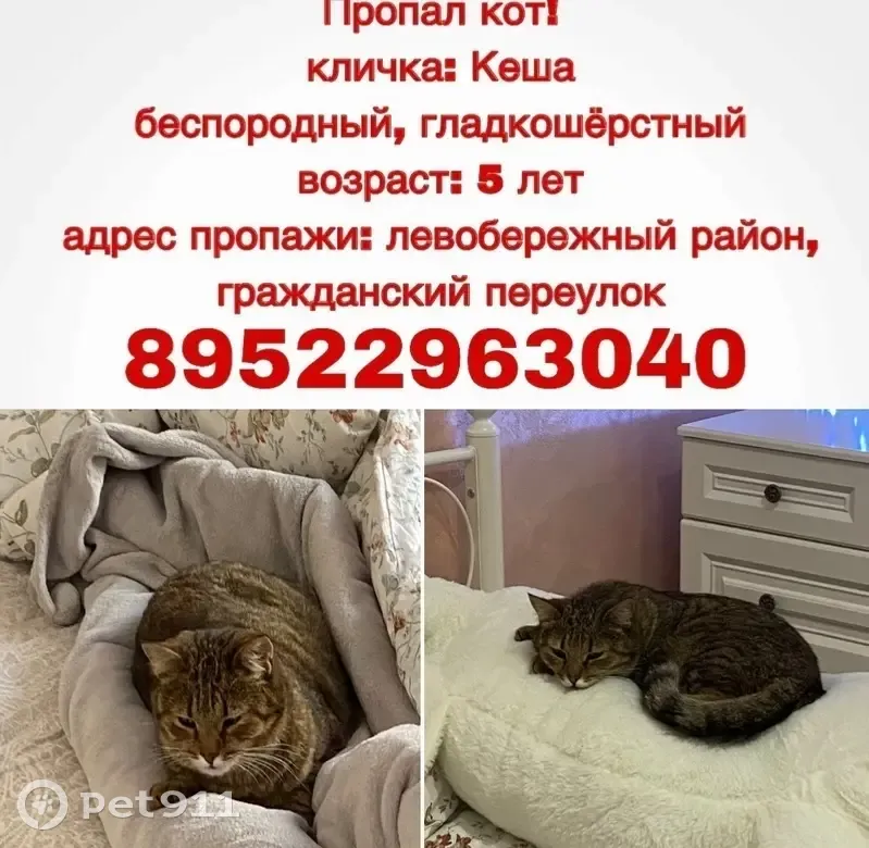 у него всегда немного приоткрыт рот, подушечки на лапах чёрные, а на макушке темной шерстью рисунок как «морда зайчика»всегда гулял перед домом, но в один вечер не вернулся домой