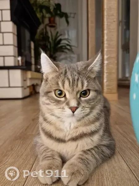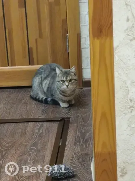Серый, мраморно-полосатый, хвост как у енота, средней пушистости. Отзывается на Тайсон или кс-кс/на-на. На позвоночнике у хвоста шерстка раздвигается до подпушка - образуется белое пятнышко.
