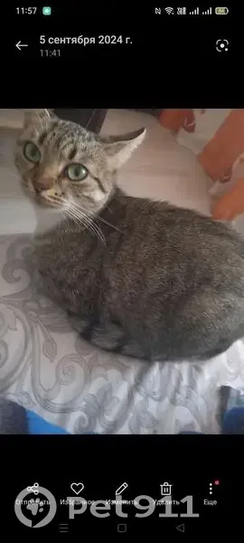 Трёх цветная, полосатая, вреди лапки белые чуть чуть, сзади как будто в гольфах. Грудка белая. Животик чуть выбрит после стерилизации. Муж решил ей показать улицу, а она выскочила из рук и убежала. Очень пугливая. Откликается на Марусю или масю.