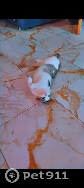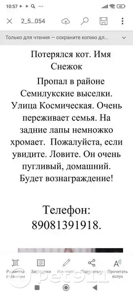 Белый. Цвет с окраской сероватой спина. Задняя лапа. Когда наступает немножко хромаетесли внимательно посмотреть, он очень пугливый домашний дома родился. Если увидите, найдётся удержите его, он может убежать или-либо испугаться зовут снежок. Семилукские Выселки Воронежулица космическая, он там пропал.
