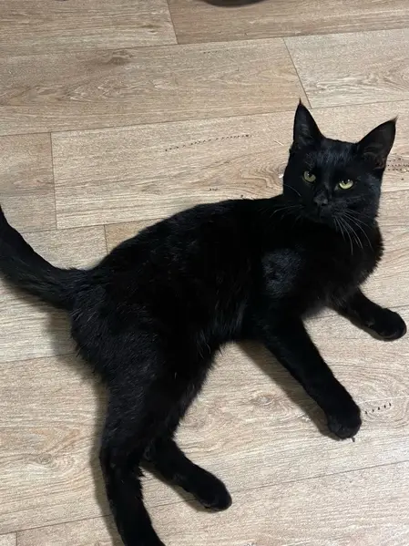 Кошечка стерилизованная 1г3 мес ,черная ,гладкошерстная,глаза почти оранжевые,имя Кисуня хорошо откликается на свое имя,вышла погулять, к людям не подходила , пугливая.