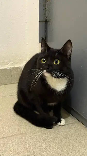 Черный кот, на лице белое пятнышко, пухленький, шерсть набивная короткая, на лапках есть беленькая тоненькая оконтовочка. Брови и Усы белые.