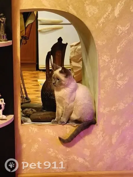 Сиамский помесь с британцем,основной окрас белый ,ушки ,хвост и лапки серые ,ярко голубые глаза.По характеру очень пугливый .Коту 7 месяцев ушёл погулять ,всегда возвращался на ночь ,на этот раз не вернулся .