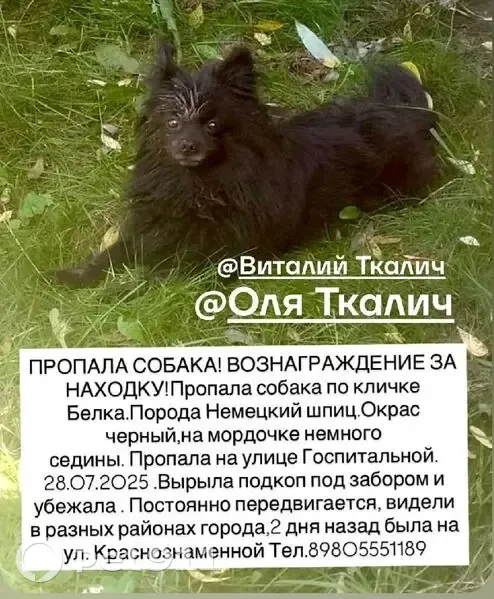 Объединено с объявлением rl1041704. Причина-дублирование информации. Описание дублирующего объявления: ПРОПАЛА СОБАКА! ВОЗНАГРАЖДЕНИЕ ЗА НАХОДКУ!Пропала собака по кличке Белка.Порода Немецкий шпиц.Окрас черный,на мордочке немного седины. Пропала на улице Госпитальной. 28.07.2025 .Вырыла подкоп под забором и убежала .Тел.89805551189