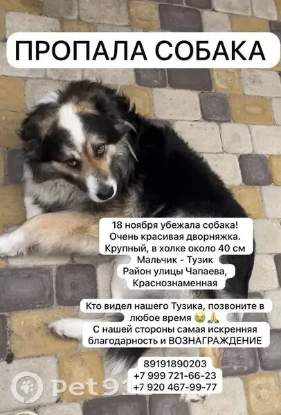Воронеж! 18 ноября убежала собака. Очень красивая дворняжка. Крупный, в холке около 40 см. Мальчик - Тузик. Район ул. Чапаева, Краснознаменная. Кто видел Тузика, придержите и позвоните в любое время. С нашей стороны искренняя благодарность и вознаграждение. - 89191890203 - 89997216632 - 89204679977