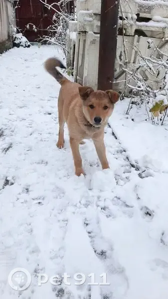 Щенок около 6 месяцев. В леопардовом ошейнике из биотана (силикона), на нем карабин и вертлюг. Очень контактный, мог увязаться за кем-то из людей, зовут Лис, на кличку отзывается.