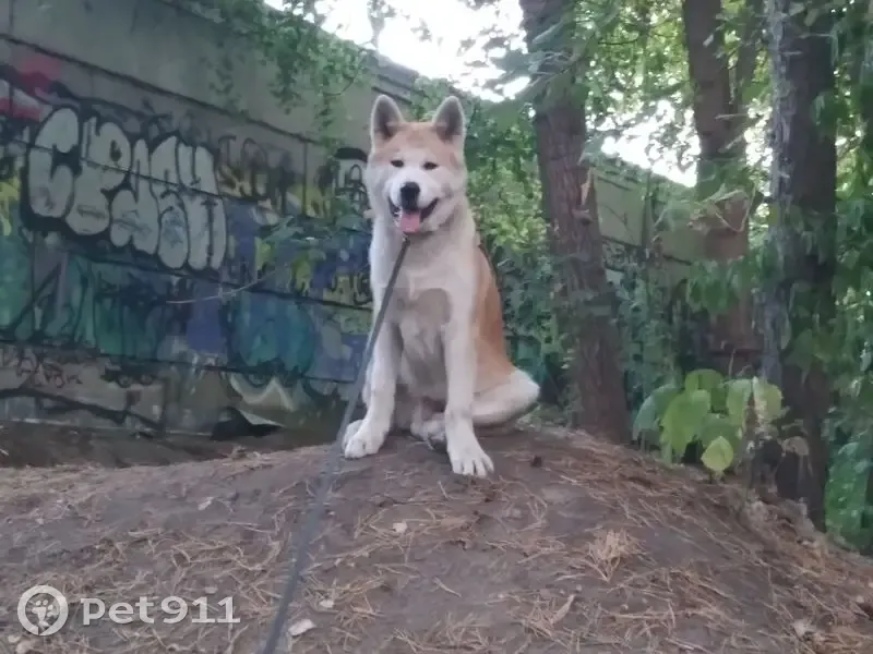 Акита ину рыжий с белым, хвост закрученный в спираль. На нем был оранжевый ошейник со светодиодами и красный поводок. Гуляли на площадке возле дома, он сорвался и убежал.