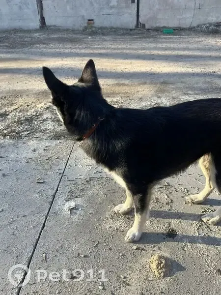 Дворняжка, примерно 45 см в холке, чёрно-белый окрас, знает команды, на шее коричневый кожаный ошейник, отзывается на кличку Пуля.