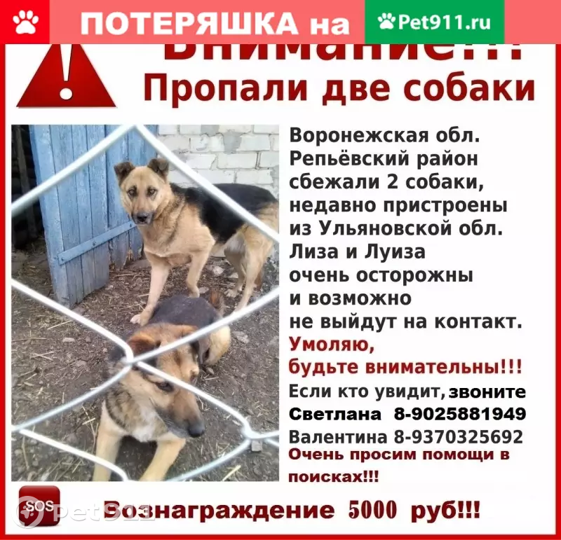 https://ok.ru/profile/340921193971/statuses/70780512764147 Убежали из села Платава. Репьевковский район. Две беспроводные собаки овчароподобного окраса. Не агрессивные, добрые, но очень осторожные,недоверчивы к людям. Они всегда вместе. Это мама и доча. Уйти далеко не могли, так как не знают местности. Бродят там в поисках пищи
