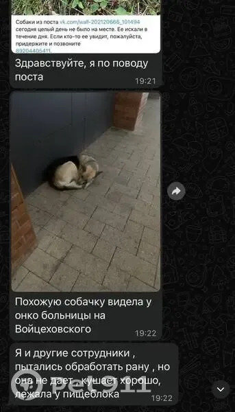 Пропала собака. На правом боку рана. Первый раз ее заметили на остановке Березовая Роща (18 - 21 сентября). 22 сентября ее уже не было на месте. 23 сентября была в районе ул. Вайцеховского. Ездили туда, но ее уже не было. Если кто-то ее увидит, пожалуйста, задержите и позвоните 89204405411, так как ей требуется помощь.
