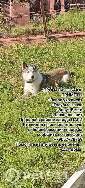 Заподносебирская лайка с голубыми глазами, левое ухо оперированое и весит, послушная, плохо слышит, спокойная выросла с тремя детьми, охотничья собака. Ушла за зверем в лесу и пропала.