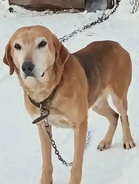 Собака с ошейником. Заднюю правую лапу видно лечили.