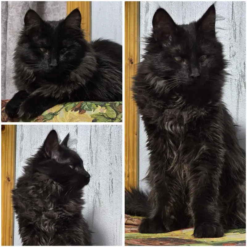 Чёрный , пушистый кот с белым пятнышком на грудке и белыми проблесками на пузике, есть 1 беленький усик , возраст примерно 1.5 года, упал с балкона со второго этажа и убежал,ласковый но пугливый