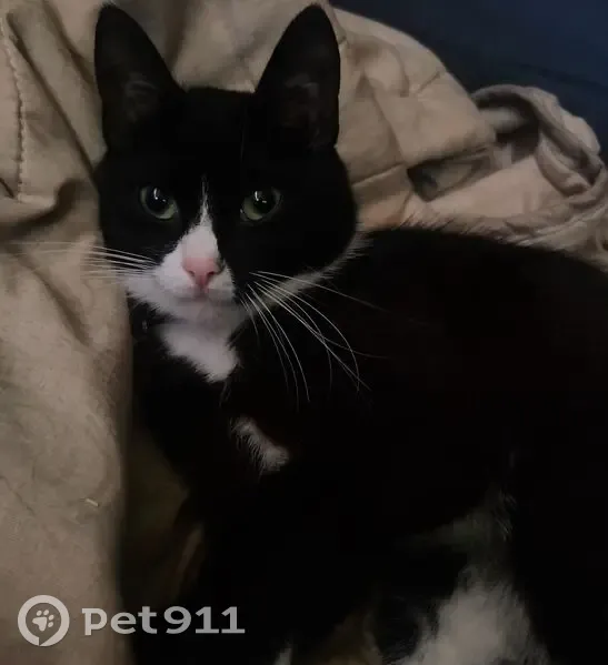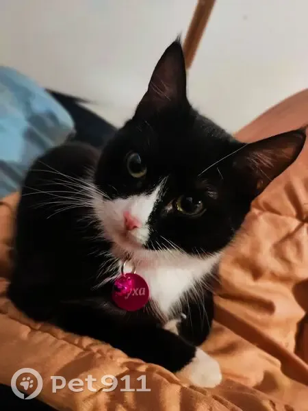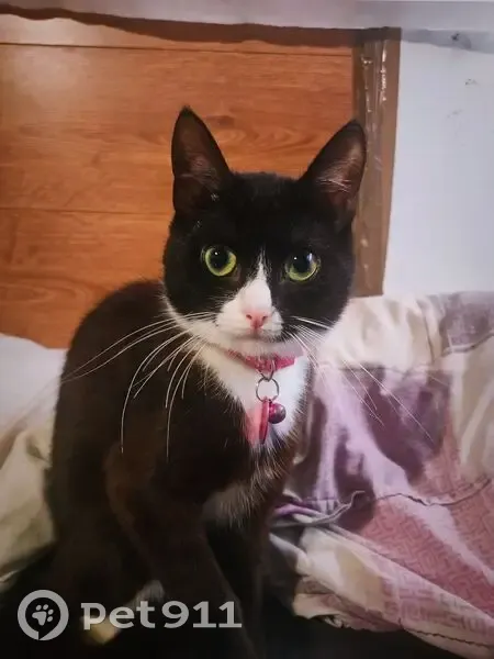 Кошечка домашняя, окрас чёрно-белый, зелёные глаза, с розовым ошейником, на ошейнике есть колокольчик, пугливая, просто так не подойдёт, пропала 20 числа, открыла окно и пошла гулять, в итоге пропала, не стерилизованная