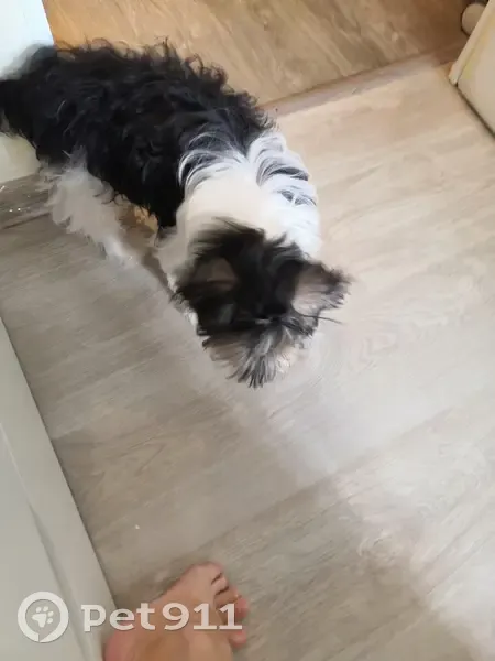 Белый в черные и коричневые пятна, кудрявый, доброжелательный, расположен к людям. У него коричневый ошейник и медальон в виде лапы. Сбежал, выкопав яму под воротами