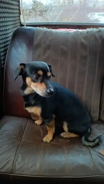 Той-терьер, но слегка больше, чем стандарт по породе. Черно-коричневая, с белым пятнышком на груди. Общительная, легко идет на контакт с людьми, может сесть в машину, так как любит кататься на машине. Без ошейника и адресника, так как очень сильно боится их одевать (возможно, первый хозяин бил поводком)