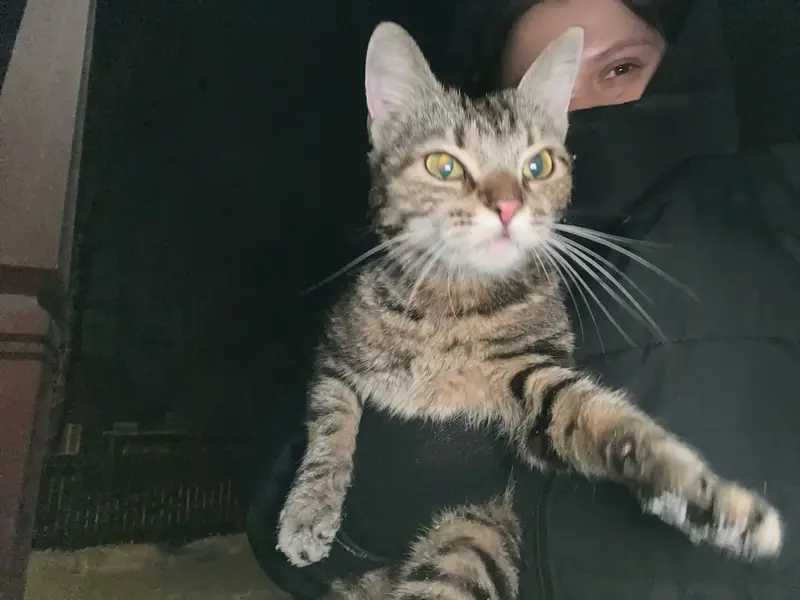 вчера вечером пришла к нашему дому. Очень плакала, запустила ее на ночь погреться и покормила. Видно по ней что социализированная и любвеобильная. Ручная. Темная в полоску. Очень красивая