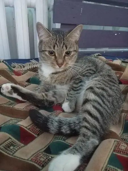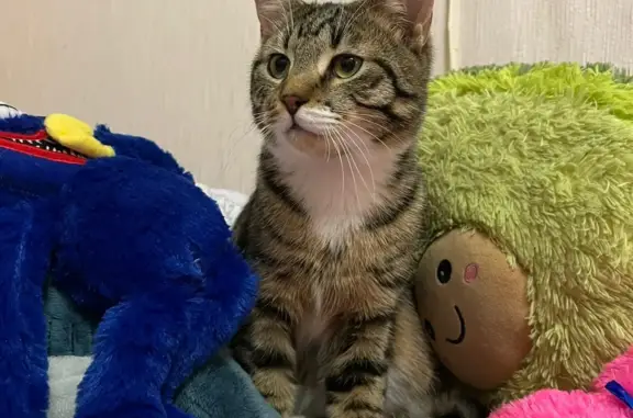 Коту на вид года 4, небольшой, короткошерстный. Пестрой окрас, белые лапки. Ласковый, но немного пугливый. На выходных на даче прибежал к нашему дому, так как сейчас на даче никто не живет.