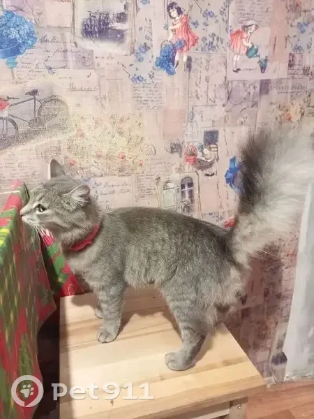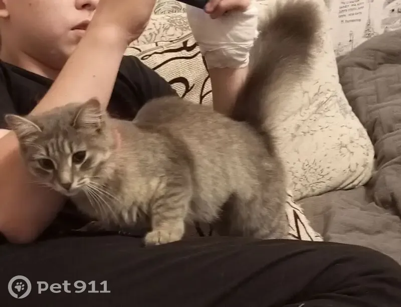 На ул. Казанский проспект недалеко от парикмахерской "Чио Чио" найдена кошка серо-полосатого окраса с пушистым хвостом, с розовым противоблошиным ошейником.