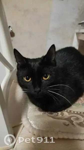 Черный с тонким белым галстуком на шее, гладкошерстный, хвост длинный толстый, глаза ярко желтые или ярко оранжевые зависит от освещения( помесь британца и бегала) кастрированный , нрав дикий, к людям не подходит, если присмотреться можно различить полоски на морде и пятна на теле( похож на пантеру в миниатюре) на морде от ушей до глаз практически нет шерсти, видны белые залысины( по породе)