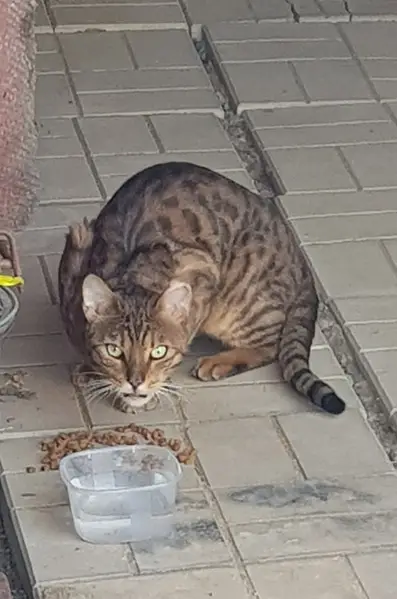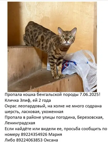 Бенгальский кот, вроде бы девочка, немного кривые усы, довольно ласковая, отзывается на кскс