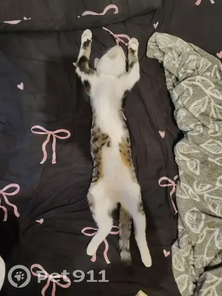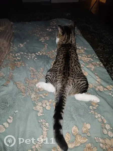 Кот выпрыгнул в окно, раньше на улице не гулял, ему 8 месяцев, вес 5 кг, не кастрирован. Окрас: четкие полосы на бедрах, переходящие в пятна по спине. Лапки, живот и грудка- белые. На лбу узор, словно жук большой.
