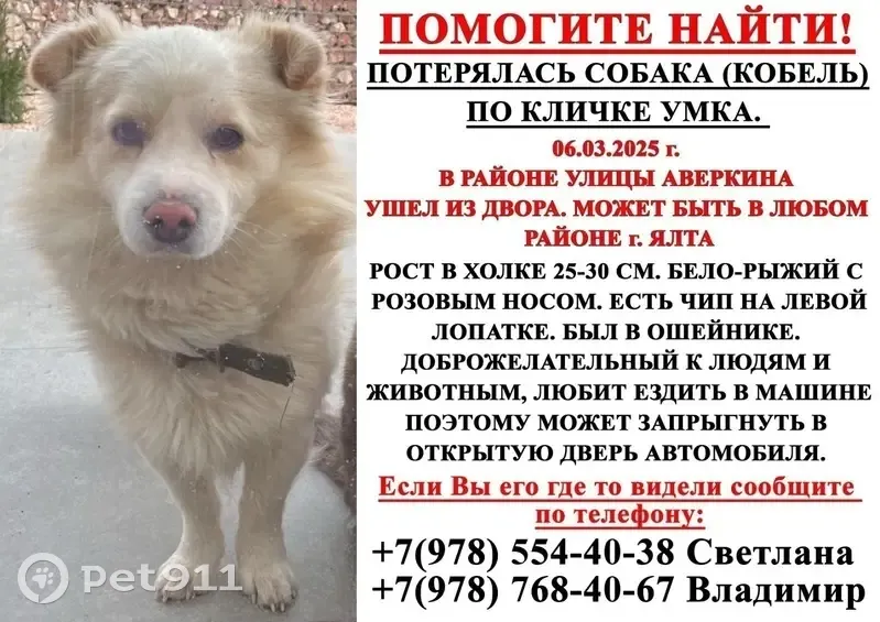 Потерялась собака (кобель) по кличке Умка. 06.03.2025г. В районе улицы Аверкина ушел со двора. Может быть в любом районе г.Ялта. Рост в холке 25-30 см. Бело-рыжий с розовым носом. Есть чип на левой лопатке. Был в ошейнике. Доброжелательный к людям и животным, любит ездить в машине поэтому может запрыгнуть в открытую дверь автомобиля. Если Вы его где то видели сообщите по телефону +79785544038 Светлана +79787684067 Владимир Вознаграждение гарантируем ! Помогите вернуть питомца домой!