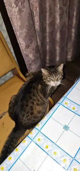 Кошка или кот , серо-бежевый, очень добрый все это время приходил к нам, мы кормили и он уходил, мордастенький , но худой . Время когда впервые появился у нас приблизительное