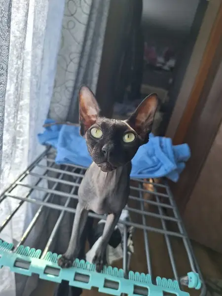 Нашлась кошка породы Корниш Рекс угольного цвета в Дзержинском районе , проезда Шавырина г. Ярославля сидела прям у двери на лестничной площадке , пока взяли на передержку к себе. Фотография нечеткая так как прячется. Есть видео , если узнали свою кошку просьба написать мне .