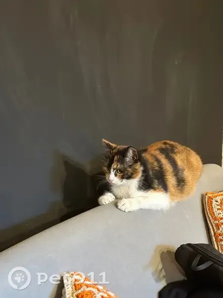 Трехцветная кошка найдена во дворе Ушинского 32. Мяукала и ластилась. Была на стрессе Ухоженная, упитанная, ходит в лоток. Розовое пузико, как будто было выбрито при узи