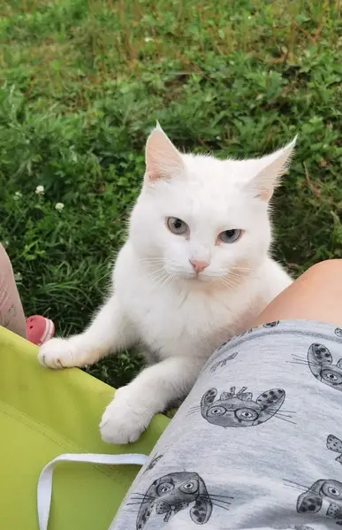 Нашли кота, белый, небольшое затемнение на хвосте, голубые глаза. Очень исхудал и обезвожен. Нужен присмотр так что срочно ищем хозяина. Кот в возрасте. Сводили к ветеринару, нам сказали, что кот в принципе здоров, но нужно наблюдать.