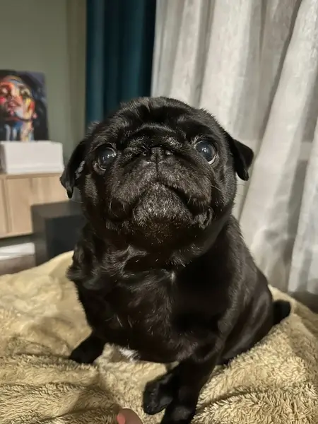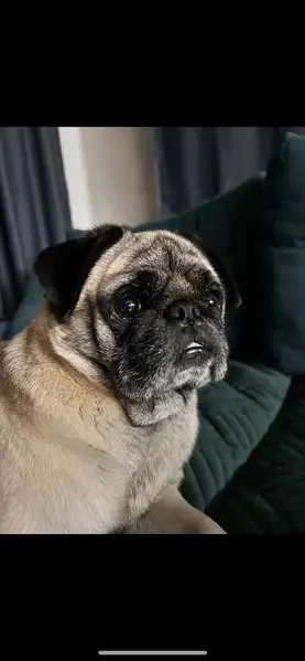 Найден мопс чёрного цвета, без ошейника, без клейма, кастрирован, лет 5-7.Что то с задними ногами, как будто или Косолапов, или подволакивает. Был один на жаре, забрала к себе домой, очень много пил и покушал