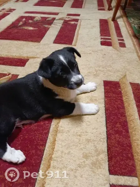 Увязался за дочерью в районе остановки Октябрьская площадь щенок чёрно-белый окрас ( лапки белые,кончик хвостика,шея и белая полоска вдоль мордочки, остальное всё чёрное) предположили вид породы русско-европейская лайка,уж очень схожи.